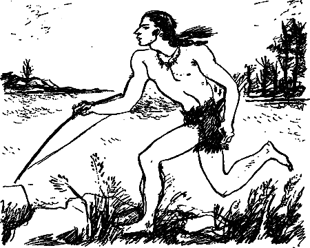 Кабаненок забился сильнее; тогда охотник вынул из-за ременного пояса тяжелый черный камень, острый с одного конца и тупой с другого, насаженный на дубовую рукоятку и тщательно отшлифованный со всех сторон. Ударом в лоб охотник оглушил кабаненка, и тот замер на месте, вытянув задние ноги. Охотник присел на корточки, погладил рукой жертву и зашептал: