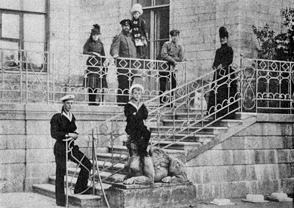 Императорская семья в 1888 г. На балконе (слева направо): великая княжна Ксения, император Александр III с княжной Ольгой на руках, рядом с ним наследник престола, будущий император Николай II, и императрица Мария Федоровна; внизу (слева направо): великие князья Георгий Александрович и Михаил Александрович