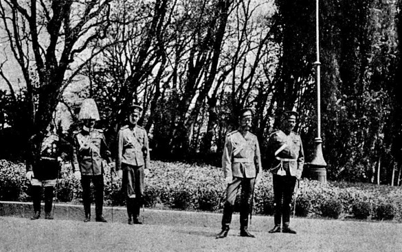 Николай II в летней резиденции в Петергофе в 1912 г. Позади великий князь Дмитрий с двумя иностранными военными атташе