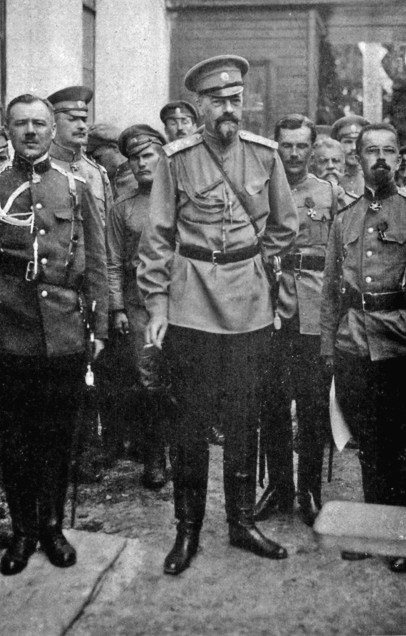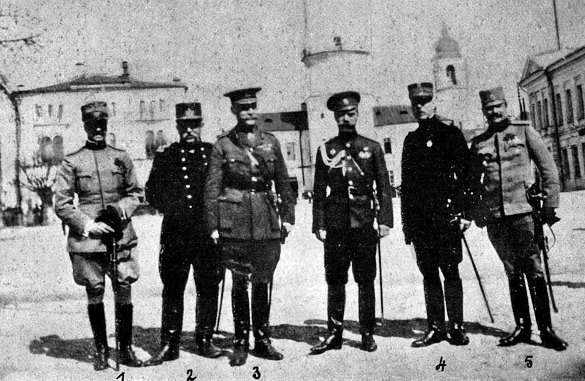 Николай II – Верховный главнокомандующий русской армией в Могилеве, с военными атташе союзных стран: полковник Марсенго (Италия, крайний слева), барон Рикель (Бельгия, второй слева), генерал Вильямс (Великобритания, третий слева), маркиз де ла Гиш (Франция, второй справа), полковник Лондкевич (Сербия, крайний справа)