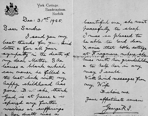 Письмо короля Георга V великому князю Александру Михайловичу по случаю кончины вдовствующей королевы Александры