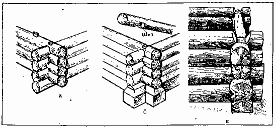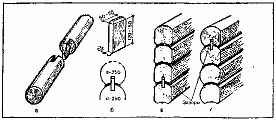 а – скрепление бревен прямым шипом по длине; б – скрепление бревен между собой шипами; в – бревна внутренних стен, отесанные на два канта; г – бревна наружных
