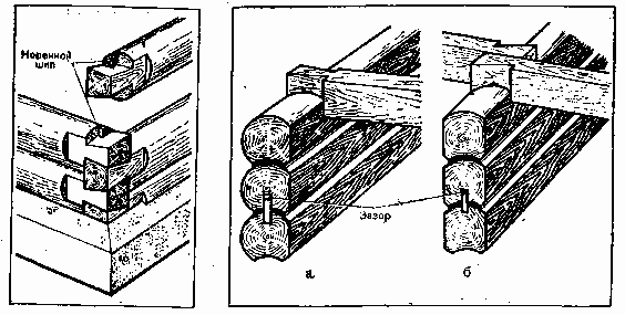 Венцы для прочности скрепляют по длине шипами, ставя их через 1 – 1,5 м. Толщина шипов – 25 мм, ширина – 60 – 70, высота – 120 – 150 мм. Гнезда под них делают на 20 – 30 мм глубже. Шипы ставят чаще в последние два венца, между которыми врубают потолочные балки. Вследствие усушки древесины и уплотнения теплоизоляционных материалов сруб за один-полтора года после возведения дает .усадку примерно на 1/20 его высоты.