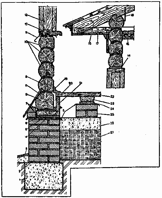 Рис. 100. Разрез фундамента и стены рубленого бревенчатого дома: