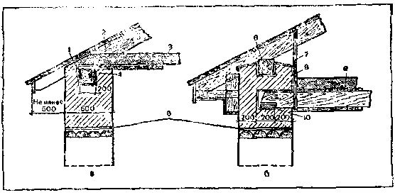 1, 9 – толь; 2 – пробки; 3 – перемычка; 4 – толь под мауэрлатом; 5 – мауэрлат; 6 – веревка; 7 – стропила; 8 – кобылки; 10 – лесенки; 11 – штукатурка; 12 – отмостка