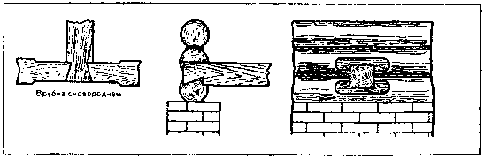 Рис. 118. Врубка балок в деревянные рубленые стены, укладываемые на сплошном цоколе