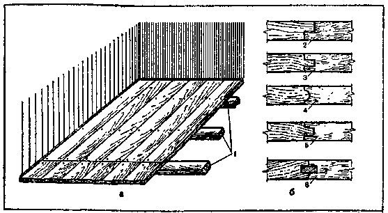 а – стыкование досок при настилке пола; б – виды шпунтованных досок; 1 – лаги; 2 – с фальцем; S – с прямым шипом; 4 – с сегментным шипом; 5 – с трапециевидным шипом; – 6 – рейкой в шпунт