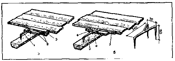 а – обычными скобами; б – скобами Смолякова; 1, 5 – скобы; 2 – клинья; 3 – кусок доски; 4, 7 – клинья; 6 – лага