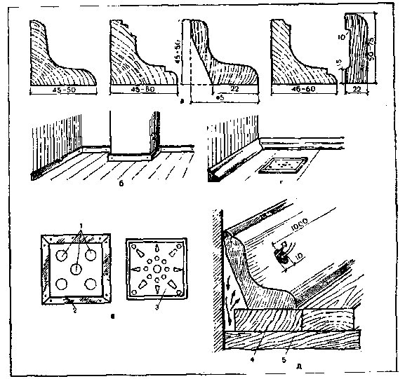 а – профили плинтусов; б – установленные плинтусы; в – рамка; г – установка решетки нл пол; д – плинтус с нащельниками; 1 – отверстия; 2 – рамка; 3 – решетка; 4 – пол; 5 – балка