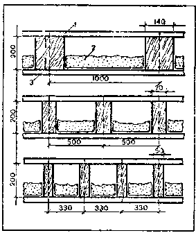 Рис. 129. Расположение брусчатых и дощатых балок: 1 – чистый пол; 2 – засыпка по толю или смазке; 3 – подшивка