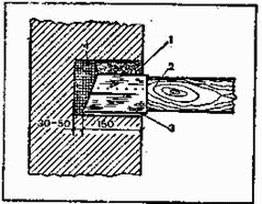Из-за конденсирования теплого воздуха, проникающего из дома, с холодным, находящимся в гнездах, концы балок нередко загнивают. Этого можно избежать, если между стенами и концами балок оставить пространство с хорошей вентиляцией. Поэтому гнезда, оставляемые, например, в кирпичных стенах, для укладки балок делают несколько больших размеров, чем концы балок. Нижняя часть гнезда должна быть как можно более ровной, поэтому перед укладкой балок ее нужно выровнять бетоном и уложить два-три слоя рубероида (толя). Глубина гнезд в каменных зданиях обычно составляет 250 мм, а концы балок кладут на длину не менее 150 мм.
