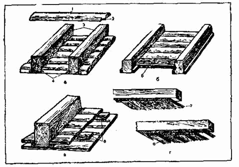 а – накат из пластин вподрезку; б – накат из дощатых щитов в два слоя; в – накат в два слоя с Л1гафрагмами; г – подшивка потолков тесом; 1 – пластина; 2 – подрезка; 3– балки; 4 – черепные бруски; 5 – накат из дощатых щитов в два слоя; 6 – диафрагмы; 7 – подшивка под штукатурку; 8 – подшивка вразбежку