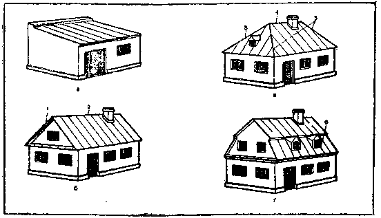 с – односкатная; б – двускатная; а – четырехскатная; г – мансардная; 1 – шипец или фронтон; 2, 4 – конек; 3 – -вальма; 5 – ребра; 6 – мансарда