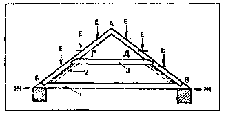 Ферма эта состоит из двух стропильных ног АБ и АВ, затяжки БВ и ригеля ГД. На стропила давит масса стропил, обрешетки, кровли, снега, сила ветра и т. п.; обозначим их буквой Е. Эти силы стремятся раздвинуть стропила АБ и АВ в направлении, указанном стрелками Ж, однако им противодействует затяжка БВ. Если затяжка не поддается растяжению, стропила могут прогнуться. Чтобы избежать этого, ставят ригель ГД, работающий в данном случае на сжатие, или бабку и подкосы. Для усиления стропил к их нижней части (от затяжки до ригеля) крепят вторые бруски – подмогу (показаны пунктиром).