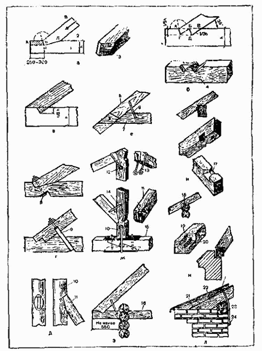 а – одинарным зубом; б – двойным зубом; в – соединение стропил в конец затяжки; г – дополнительное соединение сопряжений болтами 8 п хомутами 9; д – соединение подкоса 11 с бабкой 10; е – соединение сковороднем вполдерева; 5 – стропильная нога; 6 – скоба; 7 – ригель; ж – соединение подкосов, бабок и затяжек; 12 – болт; 13 – хомут; 14 – скоба; 15 – затяжка; з – устройство свеса при помощи балки 16; и – крепление стропилы к бревнам сруба и мауэрлату; 17 – гнездо; 18 – шип; к – примыкание концов стропил к мауэрлату; 19 – мауэрлат; 20 – гнездо; л – выравнивание прогиба кровли при помощи «кобылки» и обрешетки; 21 – кобылка; 22 – стропила; 23 – хомут; 24 – штырь