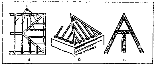 Рис. 155. Сопряжение отдельных частей стропильных ног: с – план; б – сопряжение стропильных ног; в – вариант сопряжения сковороднем; нарожники
