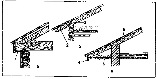 Стропильные ноги могут опираться не только на затяжки и потолочные балки, но и на бревна сруба. В этом случае в бруске (бревне) делают гнездо или шип (рис. 154, и).