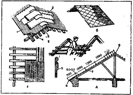 Обрешетку под асбестоцементные плитки (рис. 157,6) чаще всего делают сплошной из теса толщиной 25 мм и шириной до 120 мм (более широкие доски при короблении могут разорвать плитку), но можно оставлять зазоры между досками в 5 мм.