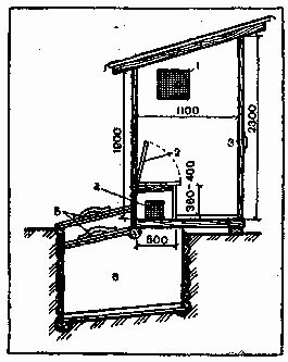 Дворовые уборные с выгребом устраивают, как показано на рисунке 11. Верхнюю часть чаще всего строят из досок, плотно пригнанных друг к другу. Крышу кроют любым кровельным материалом по сплошной обрешетке. В одной. из стен прорезают вентиляционное отверстие размером 250X250 или 300X300 мм и обивают сеткой с ячейками не реже 3X3 мм. Дверь делают плотной, закрываемой внутри и снаружи. Над выгребом устраивают стульчак (толчок) с отверстием, а под ним прорезают отверстие – отдушину для вентиляции размером от 100X100 до 200X200 мм и обивают такой же сеткой. Площадь пола – 1 м2, высота – 2 м. Выгребная яма глубиной 1,5 – 2 м разного размера, с дном, имеющим уклон в сторону люка. Размеры выгреба зависят от количества членов семьи и периодичности очистки. При очистке раз в три месяца на одного человека должно приходиться 0,25 м3 объема, а при очистке раз в год – 1 м3. Уровень нечистот не должен подниматься до уровня земли на 0,5 м.