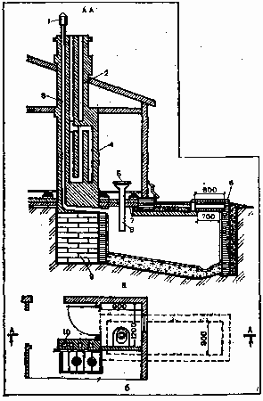 а – разрез; б – план; 1 – дефлектор; 2 – вентиляционный канал из кухни; 3 – люфт-канал; 4 – щиток кухонной плиты; 5 – приемная воронка; 6 – крышка люка; 7 – бетон; 8 – сточная труба; 9 – фундамент печи; 10 – люфт-канал