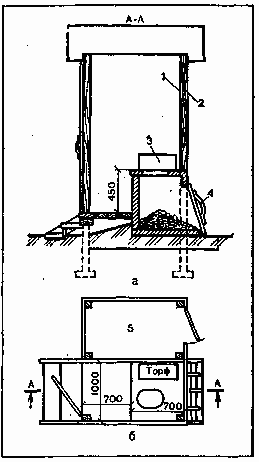 Рис. 12. Пудр-клозет: а – разрез; б – план; 1 – Окно; 2 – сетка; 3 – ящик С торфом; 4 – крышка; 5 – запас торфа