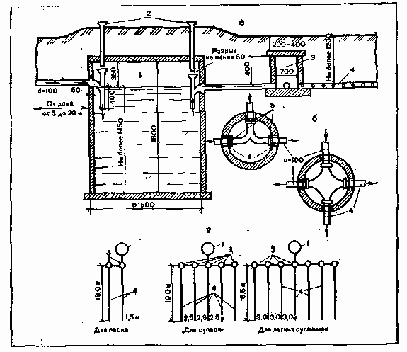Эта канализация построена по так называемому почвенному принципу очистки фекальных вод. Суть ее состоит в том, что сначала сточные воды из домового стояка поступают в дворовый трубопровод, затем – в септик (колодец) объемом 2,5 м3, рассчитанный на удаление осадков 2 раза в год, в котором они осветляются и через дренажную сеть уходят в почву (рис. 14,а).