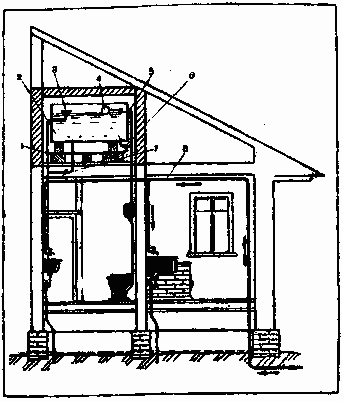 Пудр-клозет (рис. 12) строят в отдельном помещении теплой части жилого дома, обычно примыкающей к кухне. Плотный приемник-ящик пудр-клозета (деревянный или металлический) состоит из дна, верхней части – сиденья (стульчака) с отверстием, закрываемым крышкой, четырех стенок, из которых задней служит приставная крышка.