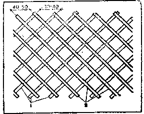 Дрань набивают в два ряда. Дрань первого ряда (простильная, толщиной 3 – 4 мм) набивают на всю стену до потолка через 30 – 40 мм (по осям), параллельно друг другу и под углом 45° к полу. Дрань второго ряда (выходная, толщиной 4 – 5 мм) набивают через 40 – 50 мм по осям под таким же углом, но в противоположном направлении. Выходная дрань, набитая на простильную, находится от поверхности на 3 – 4 мм, т. е. образует пространство, под которое затекает раствор. При набивке простильной драни каждую драницу слегка наживляют двумя гвоздями по концам. Затем крепят выходную дрань, забивая гвозди по концам через две-три простильные драницы на стенках и через две простильные драницы на потолках (рис. 213).