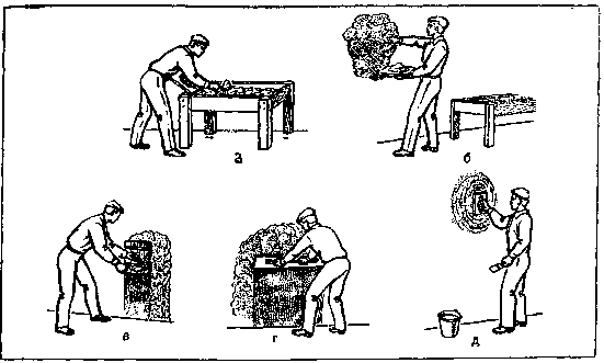Для удобства работы противень должен находиться на уровне пояса или чуть выше. Техника шпаклевания следующая. Шпателем забирают порцию– шпаклевки, наносят ее отдельными мазками (толщиной от 2 до 5 мм) на поверхность, хорошо разравнивают вертикальными или горизонтальными движениями шпателя, держа его под некоторым углом по отношению к поверхности (рис. 218,г).