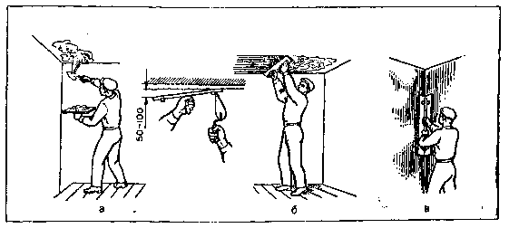 Оштукатуривая потолки (рис. 215), ящик ставят на середине помещения, раствор можно наносить лопаткой, намазывать соколом или полутерком.