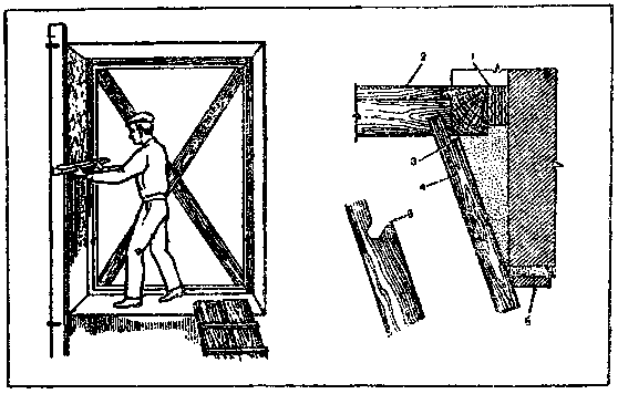 В каменных, кирпичных, бетонных и подобных им зданиях приходится отделывать оконные и дверные проемы, т. е. оштукатуривать заглушины (пространство между коробками) и откосы (часть толщины стены между коробками и стенами). Эту работу следует выполнять только после оштукатуривания стен, для чего по стенам с трех сторон (по верху и бокам) крепят правила (рейки) с ровными строгаными кромками. Затем делают малку – дощечку с вырезом. Гладкой своей стороной малка движется по правилу, а с вырезом – по коробке. Пространство между правилами и коробкой заполняют раствором, разравнивают его малкой, ведя ее по коробке и правилу. На выровненный грунт наносят накрывку и затирают ее (рис. 216).