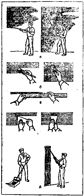 а – маховой кистью: б – ручником; е – отводка филенки: г – шпаклевание; о – валиком
