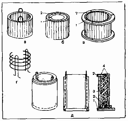 а – железобетонное кольцо; б, в – форма для изготовления простых бетонных или железобетонных колец; г – арматура; д – железобетонное кольцо с замком; 1 – доски; 2 – деревянное кольцо; 3 – железобетон (арматура показана пунктиром); 4 – доски