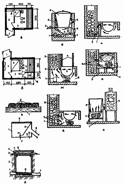 Рис. 227. Баня (размеры в см и мм): а – простая баня: 1 – тамбур; 2 – предбанник; 3 – скамья; 4 – печь; 5 – бак для холодной воды; б – табуреты; 7 – моечная; б – улучшенная баня с парилкой: 1 – тамбур; 2 – предбанник; 3 – скамья– 4 – печь; 5 – бак для холодной воды; 6 – табуреты; 7 – моечная; 8 – полка; 9 – парильня; 10 – раздевалка; 11 – стенка, отделяющая парильню от раздевалки; 12 – дверь; в – конструкция пола: 1 – лага; 2 – доски или бруски; г – трап: 1 – коробка; 2 – решетка; 3 – пластина; 4 – труба; д – смотровой колодец: 1 – труба входная; 2 – стенка; 3 – брусок; 4 – внутренняя крышка; 5 – засыпка утепляющая; 6 – наружная крышка; 7 – труба выходная; 8 – бетонный лоток; е – печь для отопления и нагрева воды: 1 – каналы для выхода тепла; 2 – кран; 3 – пазуха для горячих газов; 4 – котел; 5 – канал для отвода газов в трубу; 6 – топочная дверка; 7 – поддувальная дверка; 8 – колосники; ж – простая печь-каменка: 1 и 3 – дверки; 2 – чугунные колосники; 4 – проволока или тросик; 5 – котел; 6 – топливник; э – улучшенная печь-каменка: 1 и 3 – дверки; 2 – отверстия в стенке топливника; и – печь-каменка с дополнительной стенкой: 1 – стенка внутри топливника; 2 – отверстие в стенке камеры; к – печь-каменка с поддувалом: 1 – топливник; 2 – зольник; 3 – канал для выхода горячих газов из-под топливника; 4 – отверстия; л – печь-каменка из двух бочек: 1 – зольник; 2 – топливннкг 3 – бак для воды; 4 – патрубок; 5 – камни