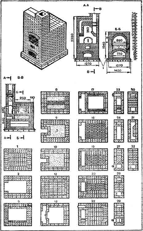Самая простая печь (рис. 69) имеет размер: ширину – 1270 мм, длину – 1650, высоту – до потолка 2380, до полатей (перекрыша печи) – 1540 мм.