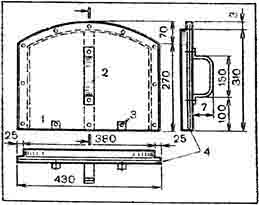 1 – полотно из кровельной стали; 2 – ручка из полосовой стали; 3 – лапки из полосовой стали для устойчивости заслонки; 4 – рамка из угловой стали 25х25х3 мм