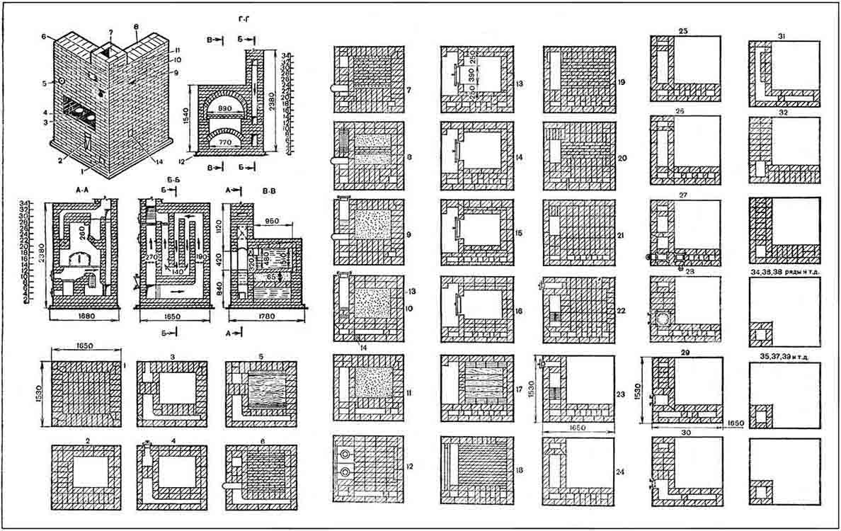 Прежде чем класть такую печь, рекомендуется выполнить ее макет, проверить работу и учесть, что в двадцать первом ряду над перекрытием выполняют засыпку кирпичным щебнем толщиной 20–30 мм с раствором глины и песка.