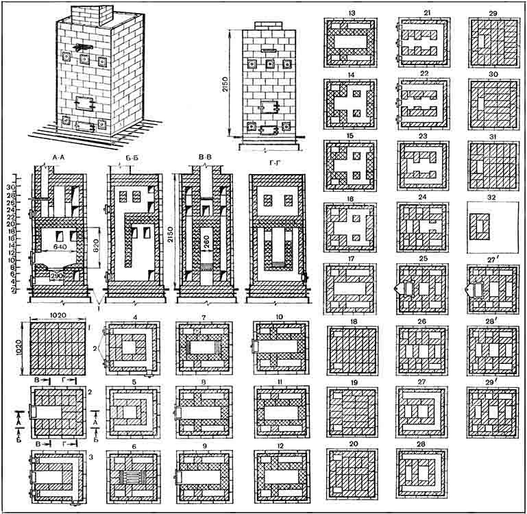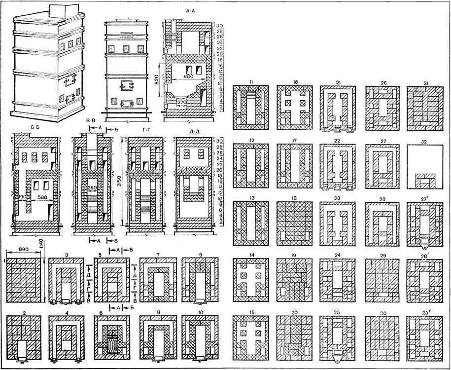 После изготовления футляра с внутренней и наружной сторон его покрывают огнеупорным лаком. Футляр состоит из нескольких звеньев. Нижнее, или первое, звено делают высотой не более 700 мм. При большей высоте работать в нем при закладке первых рядов очень неудобно. В футляре должны быть тщательно размечены и выполнены места для поддувала, дверок, чисток, задвижек. На внутренней стороне футляра ставят 6-10 кляммер из ленточной стали для крепления футляра к массиву печи. Передние и задние стенки кладут в половину, а боковые – в четверть кирпича.