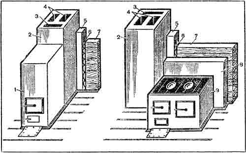 1 – печь; 2 – коренная труба; 3 – вентиляционный канал; 4 – дымовые каналы; 5 – разделка; 6 – изоляция из двух слоев войлока, вымоченного в глиняном растворе; 7 – стена; 8 – кирпичная стенка; 9 – плита