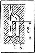 На рисунке 81 показаны коренные трубы и присоединение к ним в отдельности печи и плиты – кухонного очага. Если же к одному дымоходу присоединить две печи, и особенно на разных этажах, то возможен перебой тяги верхних печей печами нижнего этажа. В исключительных случаях допустимо присоединение к одному дымоходу двух печей, находящихся на одном этаже. Для этого в общем канале выполняют рассечку, то есть перегородку высотой от 750 до 1000 мм (рис. 82), или присоединяют печи на разных уровнях. Это делают для того, чтобы не получилось встречного движения дымовых газов. При этом надо помнить, что размер общего дымового канала должен быть не менее 140x270 мм.