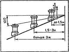 Расположение труб над кровлейДымовые трубы располагают в здании так, чтобы они как можно ближе выходили к коньку крыши, выше которой делают головку трубы. В насадных трубах эти условия зависят от расположения печи в помещении. Так как дымовая труба находится сверху крыши, то есть ее головка подвергается воздействиям различных атмосферных явлений, рекомендуется ее класть не на глиняном, а на известковом, цементно-известковом или цементном растворе. Высота трубы сверх крыши зависит от того, на каком расстоянии она отстоит от конька (рис. 84). Головку выводят на 500 мм выше конька в том случае, если она расположена не далее 1,5 м от конька по проведенной горизонтальной линии. Головку выводят до уровня конька крыши в том случае, если она находится от конька на расстоянии 1,5–3 м и ниже уровня конька крыши до прямой под углом 10° к горизонту, при нахождении трубы от конька более 3 м. Труба во всех случаях должна возвышаться над уровнем крыши не менее чем на 500 мм. Если труба будет расположена близко к высокой стене или деревьям с густой кроной, ее наращивают стальной или асбестоцементной трубой, чтобы избежать опрокидывания дыма ветром.
