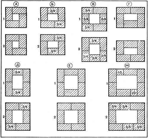 На рисунках каналы обозначены буквами, а ряды цифрами. Нечетные ряды – цифра 1, четные – цифра 2. В процессе кладки ряды чередуют. Их выполняют из целых кирпичей, целых кирпичей и трехчетверок или половинок. Все это требуется для перевязки швов. Конечно, лучшая труба та, которая выполнена из целого кирпича, лучшая кладка та, у которой над вертикальным швом нижнего ряда приходится середина кирпича верхнего ряда. Она называется перевязкой в полкирпича, обеспечивающей высокую прочность кладки. Не всегда приходится правильная перевязка кладки через один ряд по всей высоте. На рисунке 86 показана кладка двух спаренных каналов. Если их выложить на всю высоту чередованием рядов Б и В, то наружные стенки кладки будут иметь правильную перевязку, обеспечивающую необходимую прочность. Стенка, разделяющая трубу на два канала, не будет иметь надлежащей перевязки, так как укладываемые кирпичи все время находятся впритык к наружным стенкам. При чистке трубы внутренняя стенка может быть легко разрушена. Чтобы этого не произошло, через каждые четыре чередующихся ряда Б и В необходимо выложить один ряд Г, располагая кирпич так, как показано на рисунке.