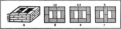 а – общий вид трубы; б – кладка нечетных рядов; в – кладка четных рядов; г – кладка пятого ряда