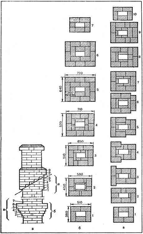 Ее кладут на стояке с тщательной перевязкой швов. Эта кладка рассматривается девятью рядами. Каждый ряд выступает вперед на 1/4 кирпича. В середине, то есть внутри выдры около дымового канала, вставляют кирпичные пластинки такой толщины, чтобы они не уменьшали и не увеличивали размеры канала.