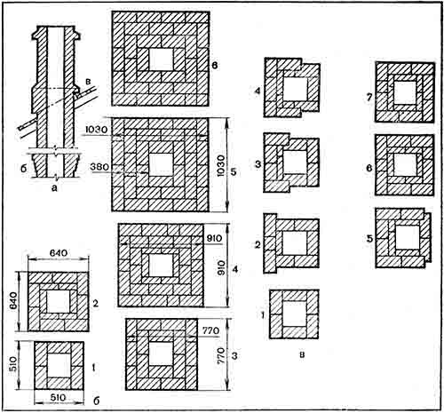 Рис. 85. Размеры дымовых каналов и их кладка: