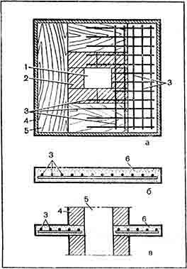 а – опалубка с расположенной арматурой; б – разрез плиты; в – плита в печной кладке; 1 – дымоход; 2 – печная кладка; 3 – арматура; 4 – бортики; 5 – опалубка; 6 – плита