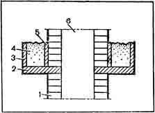 1 – печная кладка; 2 – железобетонная плита; 3 – бортовая плита; 4 – заполнитель; 5 – облицовочные плиты вокруг трубы; 6 – дымоход
