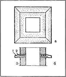 Чтобы распушка была легче, можно поступить так. Изготовляют четыре плиты такого размера, чтобы облицовать ими (укрепить на глиняном растворе) трубу, и четыре плиты бортовые, установив их по краям поддерживающей плиты, прочно скрепив и промазав все щели. Высота плит должна быть 250–300 мм. Полученный таким образом «ящик» заполняют кирпичной кладкой, топливным шлаком или шлаком, смешанным с глиной, или известью, или песком, или сухой землей без растительных примесей (рис. 91). Намного лучше бортовые ограждения делать из двух половинок. Но можно плиту изготовить сразу с бортами.