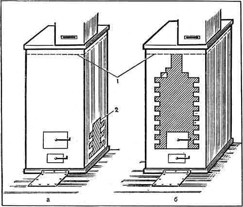 а – топливника; б – перекладка топливника и дымоходов; 1 – линия перекрытия печи (перекрыша); 2 – линия перекрытия топливника