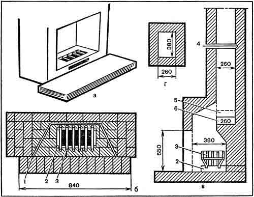 а – общий вид; б – план; в – разрез; г – дымоход; 1 – бронзовый лист; 2 – ниша под корзинкой; 3 – корзинка; 4 – задвижка; 5 – чистка, закрываемая герметической дверкой; 6 – газовый порог